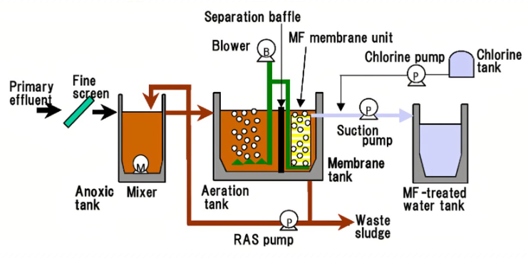 膜生物反應(yīng)器是一種新型的廢水處理系統(tǒng),它結(jié)合了膜分離技術(shù)和生物處理技術(shù),也稱為MBR。傳統(tǒng)的生物處理技術(shù)被終端二沉池膜組件取代,可以保持生物反應(yīng)器中高活性污泥濃度,有效提高生物處理有機(jī)負(fù)荷。為了減少污水處理設(shè)施的占地面積,污泥負(fù)荷可以保持較低,從而減少剩余污泥的量。主要原理是使用膜分離設(shè)備攔截水中的活性污泥和大分子有機(jī)物。其活性淤泥濃度可達(dá)8000~10000mg/L,或更高。反應(yīng)器截留效果非常明顯,可有效保留長周期微生物,實(shí)現(xiàn)污水深度凈化,增加硝化細(xì)菌增殖,除磷脫氮效果更好。